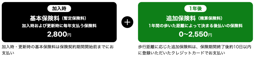 この保険は、加入時に基本保険料を支払って、1年後に、1年間の歩いた距離に応じて追加保険料を支払う仕組みのようです。